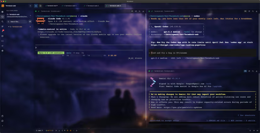 外觀上 Termdock 的 UI 做了一次整理,把多餘的框線和邊界砍掉,畫面看起來更乾淨。背景圖可以一路拉到側邊欄,不會被切成一塊一塊的。系統會看你選的背景圖,自動挑一個比較搭的 theme,目前比較適合配深色圖片,整體會順眼很多。