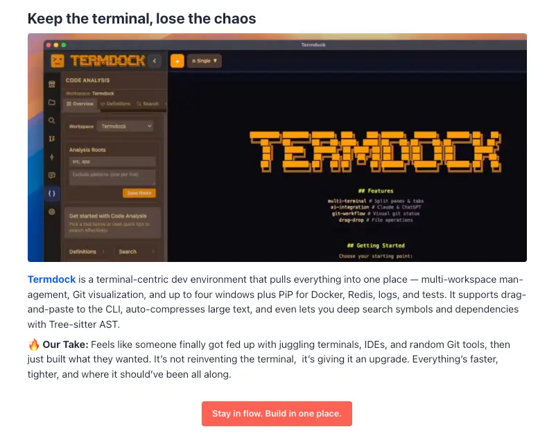 很幸運的 Termdock 當天被 Product Hunt 編輯選中了 ,很開心啊!