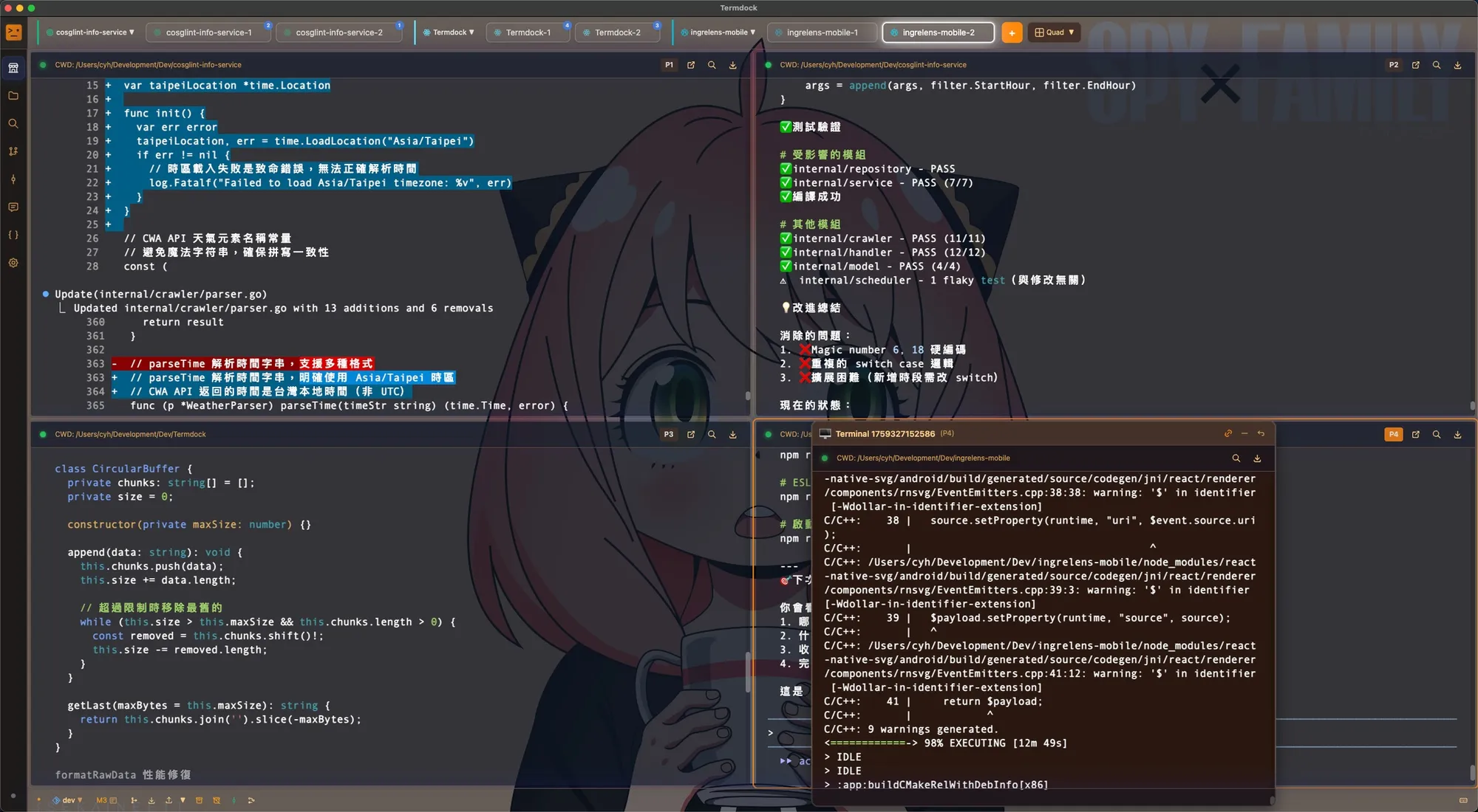 - 多終端同窗分割(最多 4 視窗 + 畫中畫)。Docker、Redis、log、測試同時跑,監看不離視線。